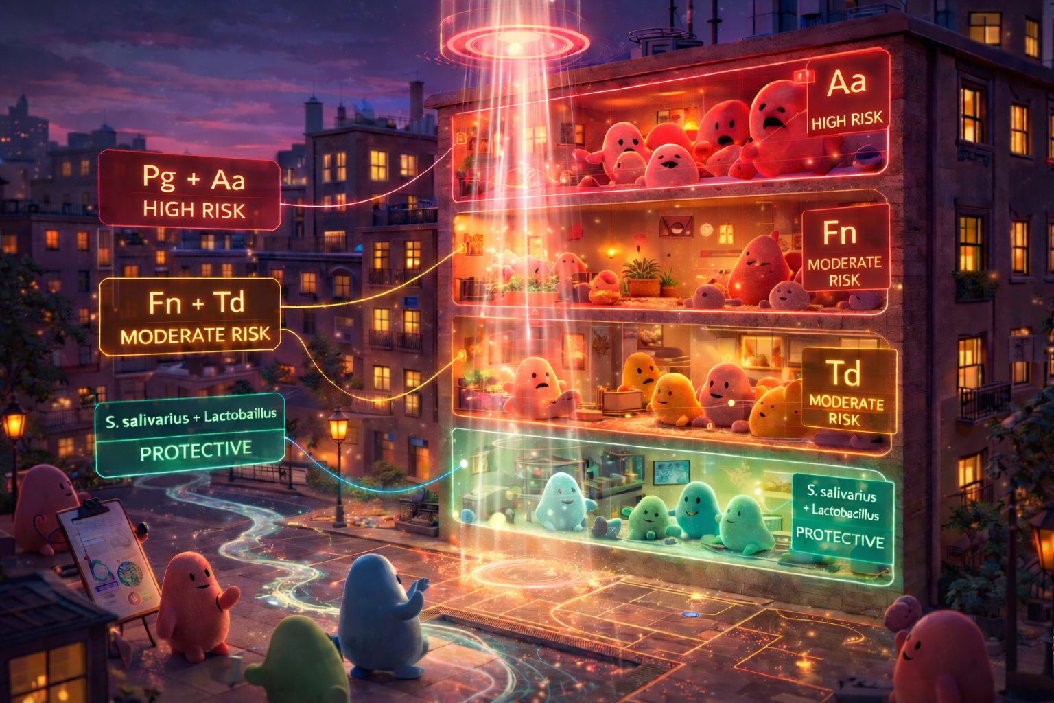Scientific context: PCR-based salivary diagnostics detect microbial DNA at extremely low thresholds, often identifying high-risk organisms long before visible clinical breakdown appears.